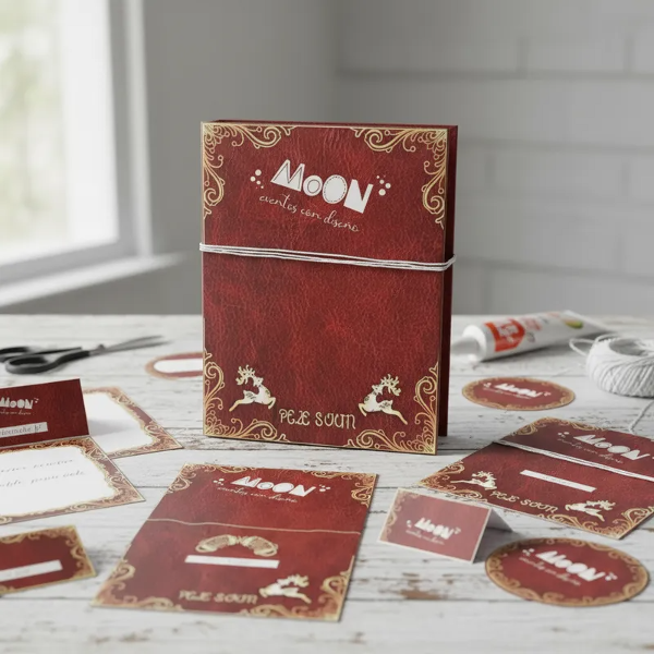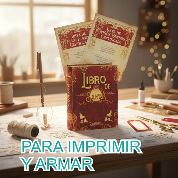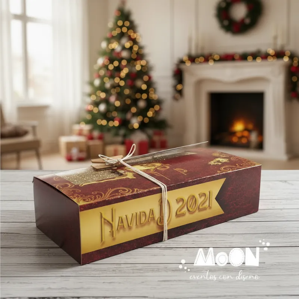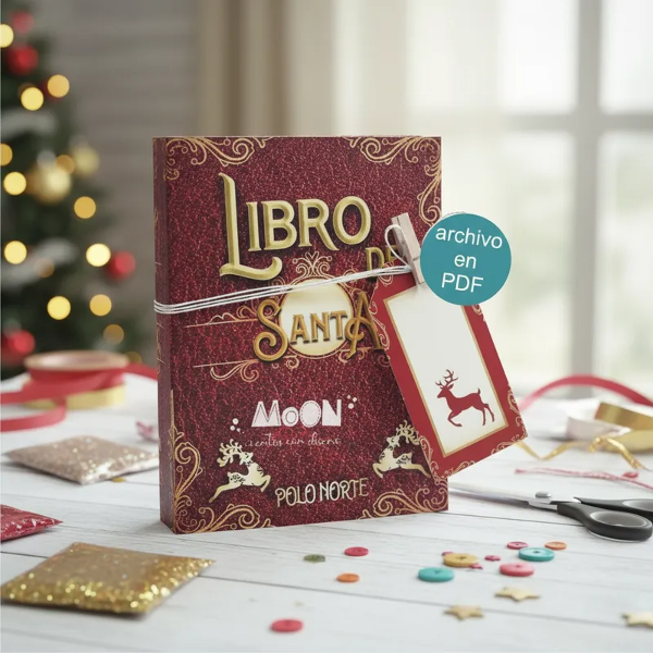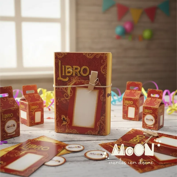 una caja golosinera con diseño y forma especial de Libro de Santa.