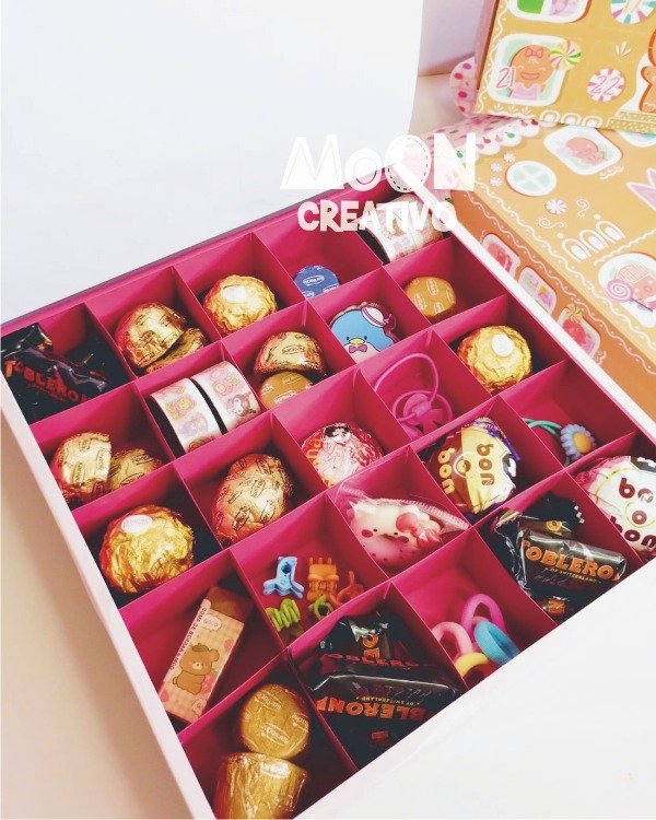 - 24 compartimentos para sorpresitas de 4 x 4 cm con troquel